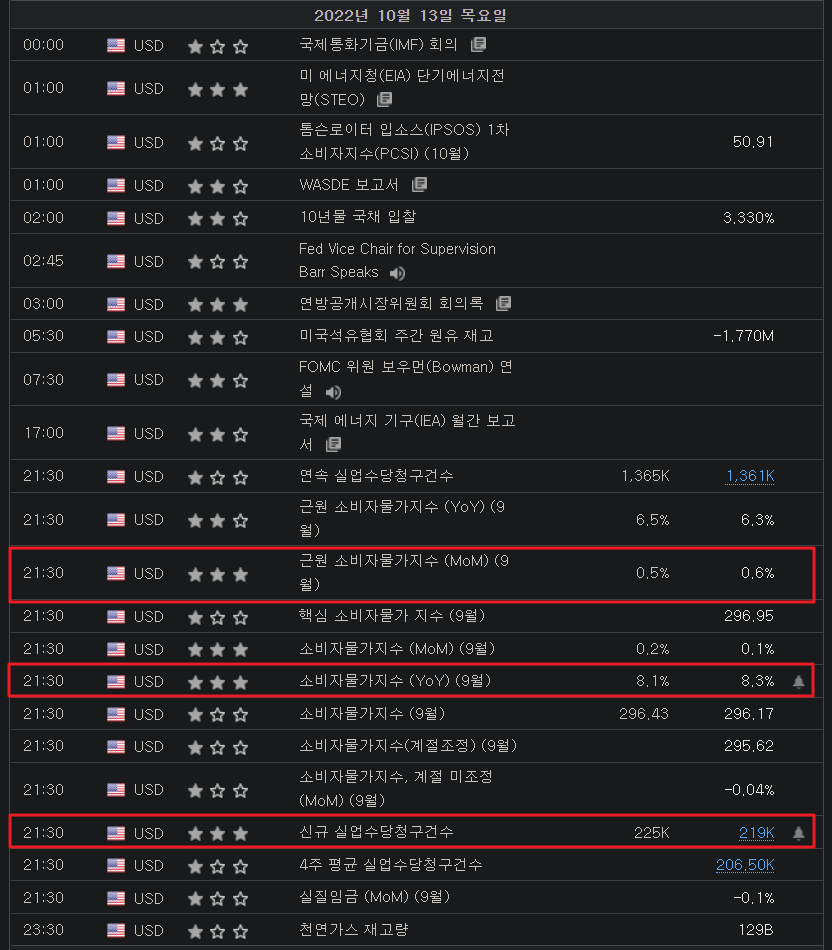 10월 13일 목요일에 미국 소비자물가지수가 발표된다.