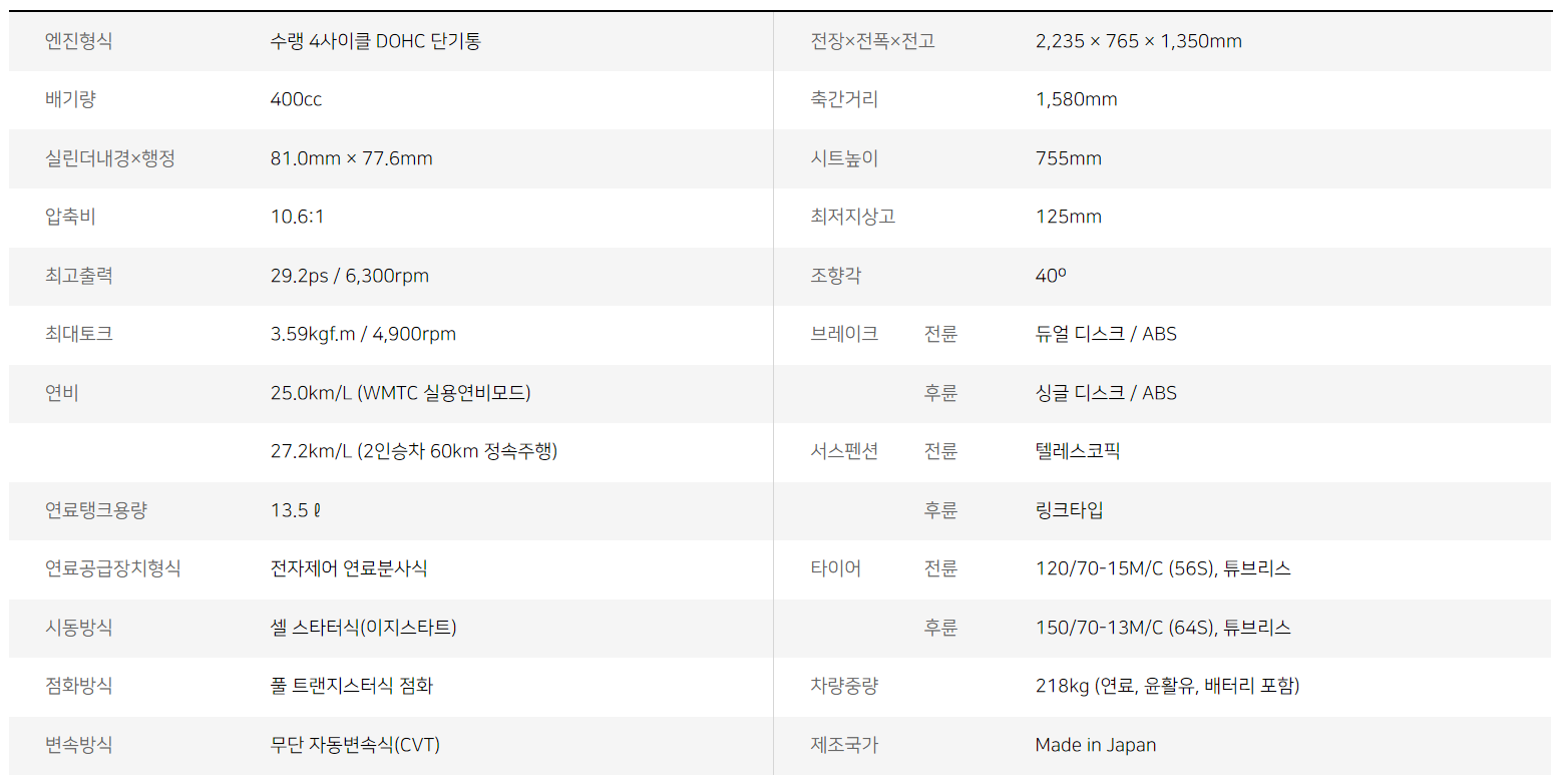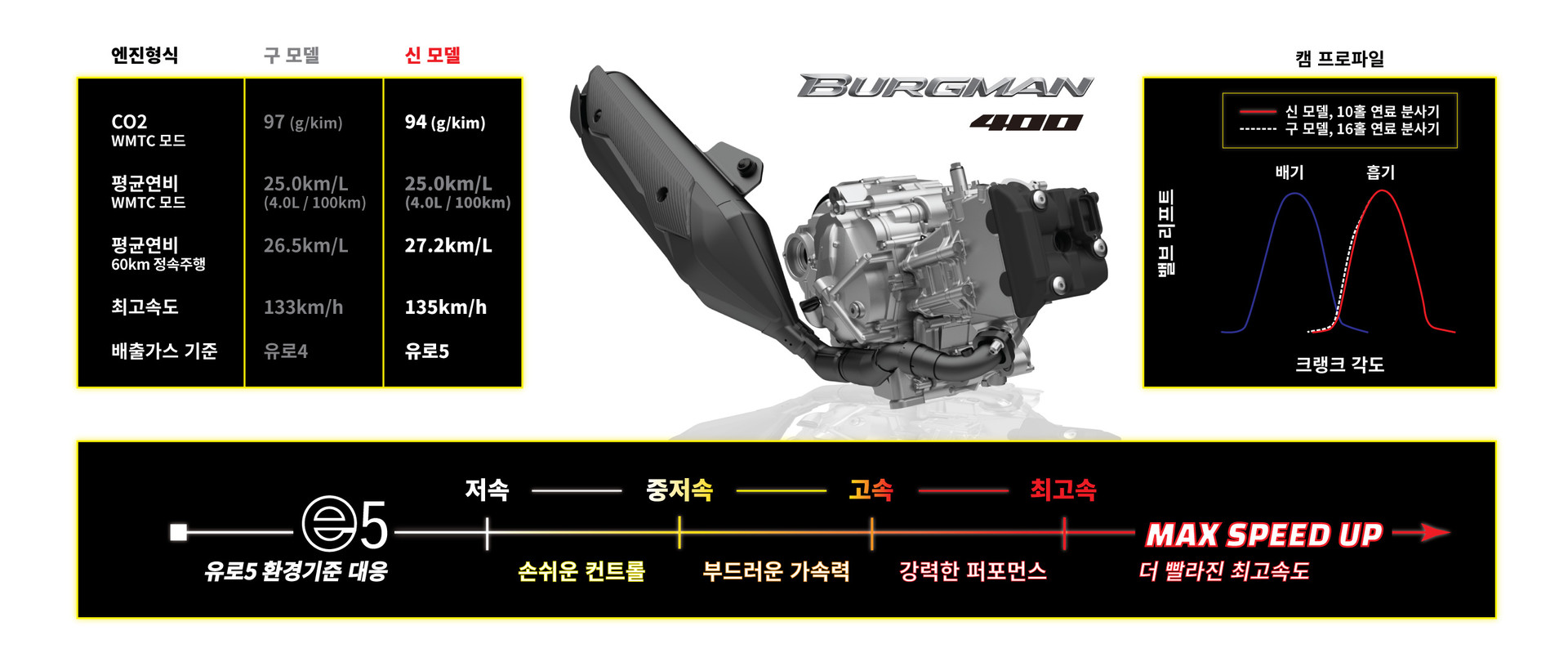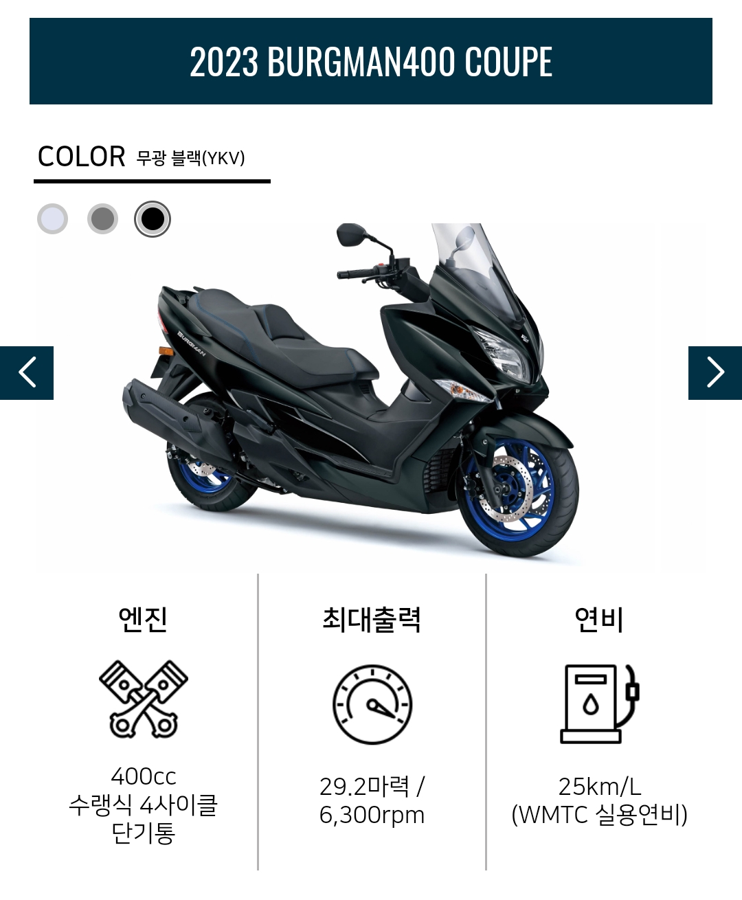 1998년 스쿠터 최초로 높은 배기량의 엔진을 탑재하며 맥시 스쿠터란 장르를 개척한 선구자. 슈트와 잘 어울리는 도시적 이미지의 품격 있는 디자인과 비교불가한 승차감을 기반으로 뛰어난 퍼포먼스와 높은 실용성을 제공하며 지난 20년간 럭셔리 맥시 스쿠터의 독보적인 입지를 지켜온 버그만. 새롭게 진화된 버그만400은 세련된 디자인과 강력한 퍼포먼스, 쾌적한 승차감을 통해 진정한 스포츠 쿠페를 정의합니다. 최적의 효율과 강력한 퍼포먼스를 제공하는 수랭 400cc 단기통 엔진과 우아하고 스포티한 스타일링, 안전을 위한 첨단 전자장비와 다양한 편의장비들이 조화되어 탄생된 올 뉴 버그만400 쿠페.
