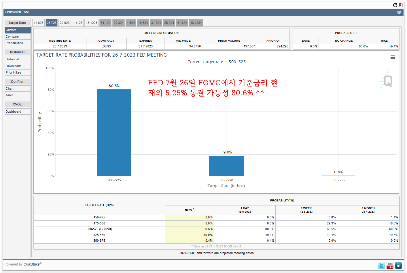 2023년 6월 14일 FOMC에서 기준금리를 5.25%로 동결 가능성 82.6% ^^